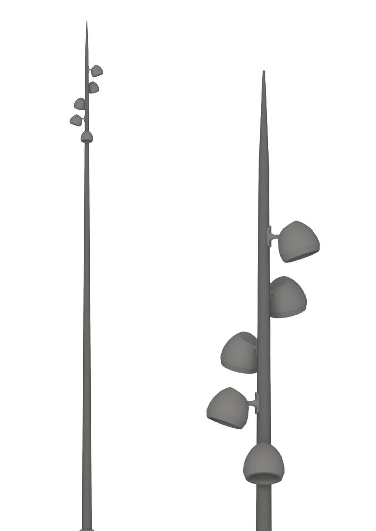 Mât acier galvanisé Ral au choix livré et déchargé composé d'un mât cylindro-conique soudures lisses, hauteurs préconisées de 6 à 10m, entraxes 200x200 et 300x300 selon caractéristiques et d'une pointe en tête. Pré-perçage en usine pour fixations projecteurs.