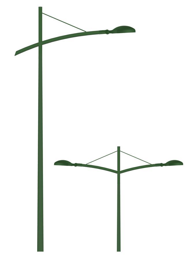 Ensembles acier galvanisé Ral au choix livré et déchargé composé d'un mât cylindro-conique soudures lisses, hauteurs préconisées de 4 à 10m, entraxes 200x200 et 300x300 selon caractéristiques et d'une console VARETA Ø60 simple ou double avec différentes inclinaisons et longueurs possibles.